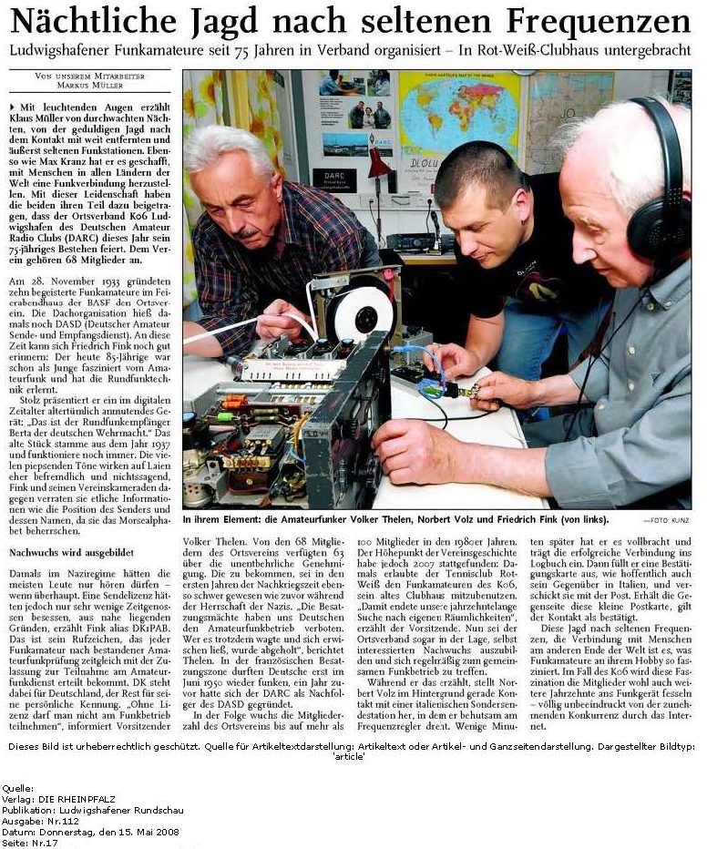 In ihrer Ludwigshafener Lokalausgabe berichtete die "Rheinpfalz" vom 15.05.2008 in einem mehrspaltigen Artikel über das 75-jährige Jubiläum unseres Ortsverbands, nachdem in der Woche zuvor der Redaktionsmitarbeiter Markus Müller nebst Fotograf bei uns zu Gast war. Wie schon beim letzten "Rheinpfalz"-Artikel vor etwa einem Jahr hatten sich auch diesmal einige OV-Mitglieder eingefunden, um dem Lokalreporter Rede und Antwort zu stehen. Für alle, die keinen Zugang zur Ludwigshafener Lokalausgabe haben, kann der Artikel auch hier eingesehen werden.